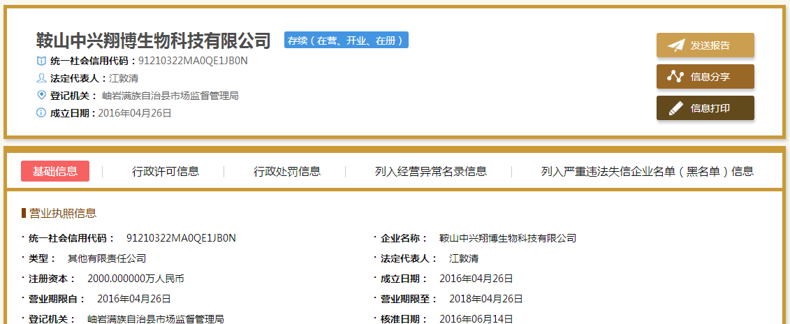 直销头条网编辑在全国企业信用信息系统查询到中兴翔博成立于2016年4月26日,注册资金2000万,法人是江敦清,股东是鞍山市翔博商贸有限公司和鞍山中兴生物科技有限公司。