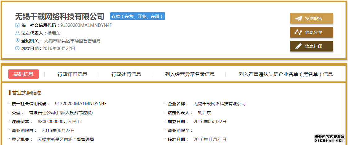 直销头条网编辑在全国企业信用信息系统查询到无锡千载成立于2016年6月22日,注册资金8800万元,法人是杨启东,股东是赵叶、乔海红、黄月成、杨丽丽、彭立争、王哲峰、连志英、吕礼红、王毛孩、魏元元、杨启东、柯志国。