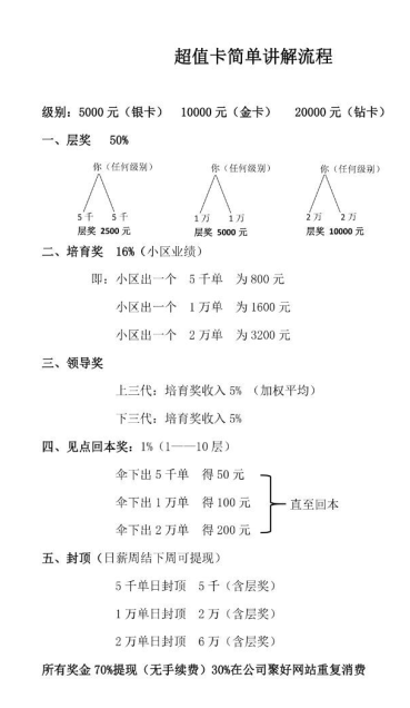 四、幸运分红:银卡拿伞下5层会员开发的10代之内见点分红10元。金卡拿10层10代,钻卡拿15层10代(按照二二复制,10层会员共计1000个点位每个会员开发的10代又是1000个点位1千乘以1千等于100万个点位见点10元可以拿到1000万,如果三三复制就更多了)