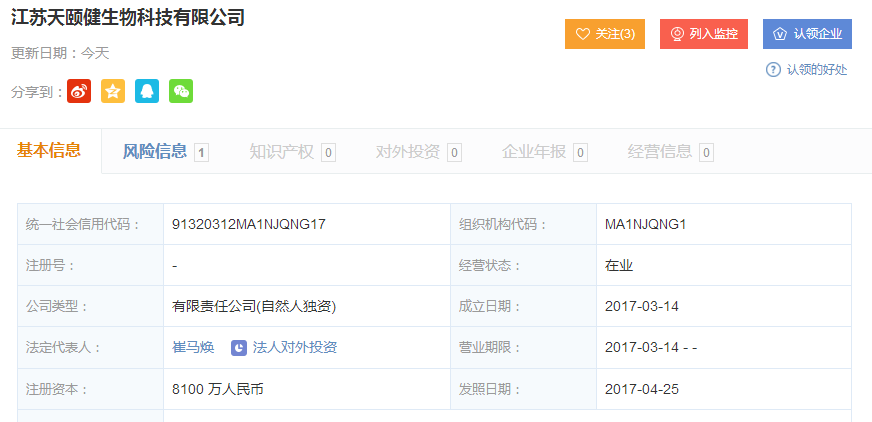 直销头条网编辑在启信宝查询到江苏天颐健成立于2017年3月14日,注册资金8100万人民币,法人是崔马焕,股东是许玉得。