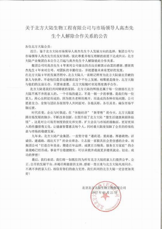 近日有信息显示出,北方大陆生物工程有限公司与市场领导人高杰先生个人解除合作关系的公告。