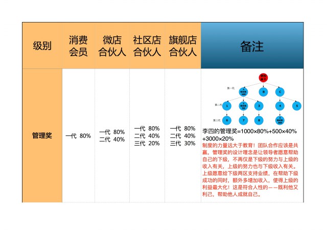 颠覆性、极具特色的管理奖,最多可以拿到五代,关键是第一代80%、第二代40%、第三代 20%、第,累计形成业绩奖150%的管理奖拨出比,前所未有的理念!