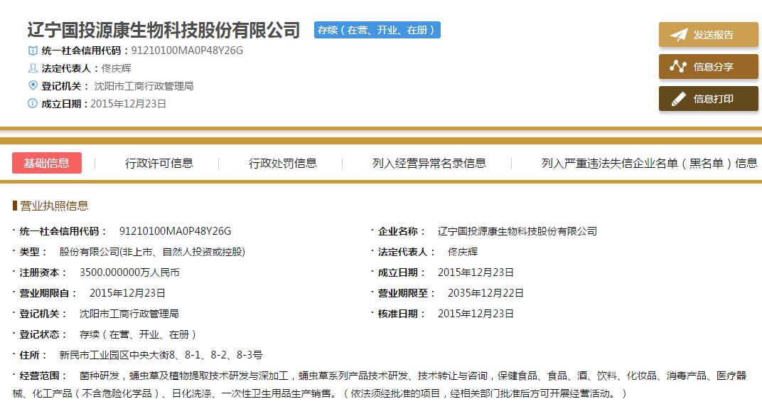 据官网资料显示,辽宁国投源康生物科技股份有限公司成立于2015年,隶属于辽宁省投资集团,注册资本3500万。公司总部坐落于沈阳市于洪区沙岭街道富沙街20-2号,生产基地分别位于沈阳市新民工业开发区中央大街8号(口服产品生产基地)和沈阳市于洪区红润路112-3-1门(外用产品生产基地),共占地约7.2万平米。公司勇于创新,致力于自主研发,旨在成为国内蛹虫草产业的龙头企业及行业的引领者和标准的制定者。