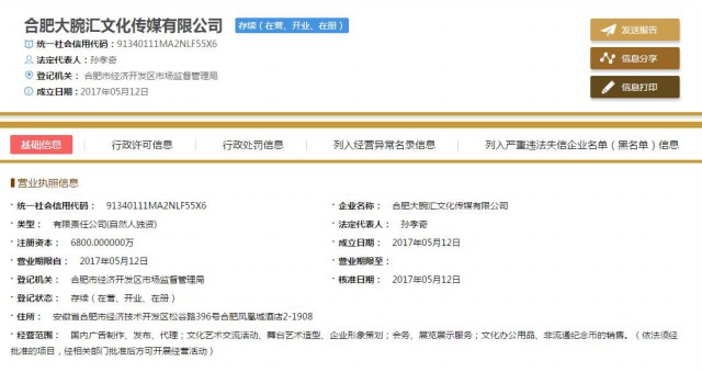 据大腕汇官网资料显示,安徽大腕汇集团积极响应国家文化政策号召,于2013年开始筹备,并于2016年底正式转型“互联网+文化”方向。旗下拥有多家子公司,国志资产管理有限公司(主营资产管理、投资管理、企业管理、投资顾问、股权投资;财务信息咨询;企业重组、并购等业务)、人之行文化用品有限公司(主营文化办公用品、非流通纪念币销售;文化艺术交流策划咨询;会展、礼仪服务;企业形象、市场营销策划等业务)、秉泰房地产有限公司(涵盖房地产开发、物业管理、装饰工程,水电安装等)、安徽古圣艺术品拍卖有限公司(国家一级拍卖行) 以及蓝莓产业园等。