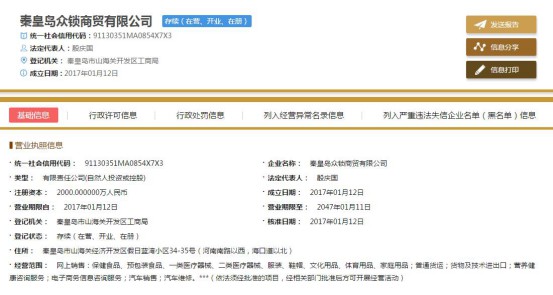直销头条网编辑在国家企业信用信息公示系统查询到众锁商贸成立于2017年01月12日,注册资金2000万元,法人殷庆国,执行总裁尤景学,总经理高武、高国然,监事王海涛。