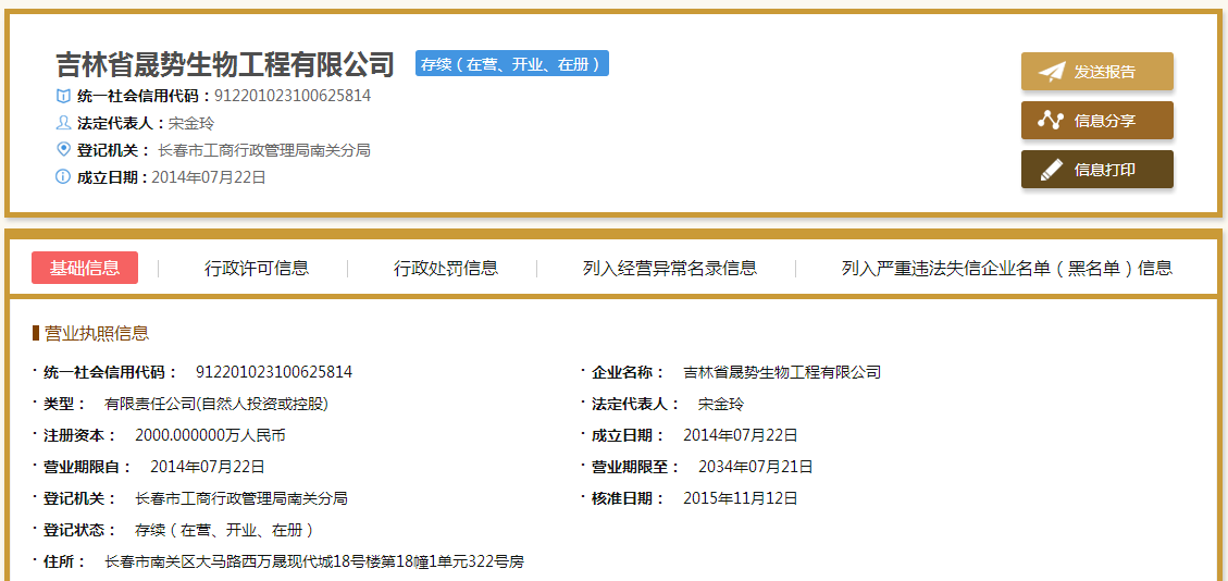 直销头条网编辑在国家企业信用信息公示系统查询到吉林省晟势生物工程有限公司成立于2014年07月22日,注册资金2000万人民币,实缴为0元。法人代表宋金玲 ,监事徐世娟,总经理宋金玲。