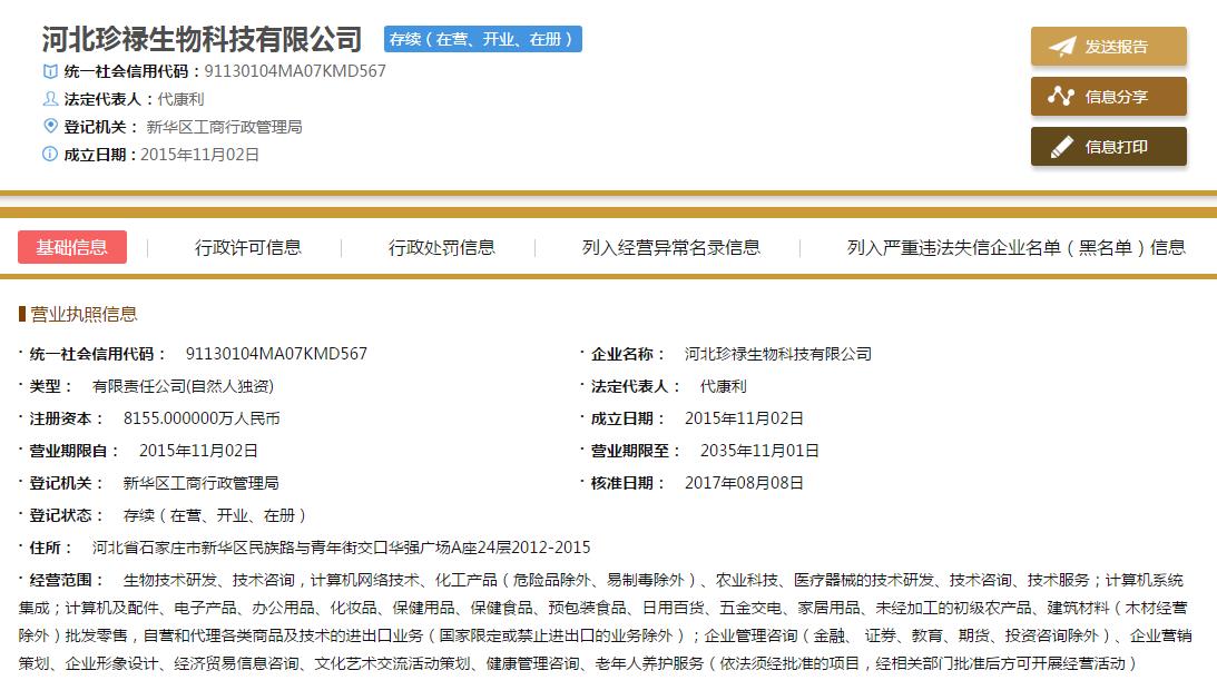 直销头条网编辑在国家企业信用信息公示系统查询到珍禄集团成立于2015年11月02日,注册资金8155万人民币(实缴资金0元),法人代表代康利,执行董事兼经理代康利,监事马小东。