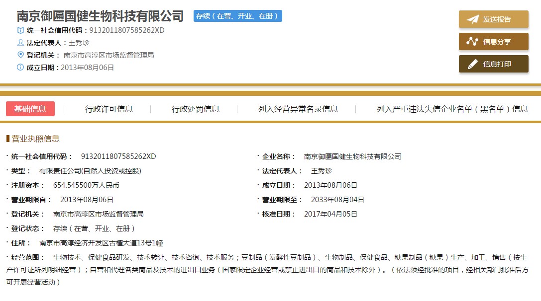 直销头条网编辑在国家企业信用信息公示系统查询到御匾国健成立于2013年08月06日,注册资金654.5455万人民币(实缴资金458.18185万元人民币),法人代表王秀珍,董事长商利华,总经理王秀珍,监事吴广善,董事有王秀珍、商利华、孔维海、张晋阳、吴勇。股东有王秀珍、商利华、北京清华永新电子有限公司、北京水木扬帆创业投资中心(有限合伙)。