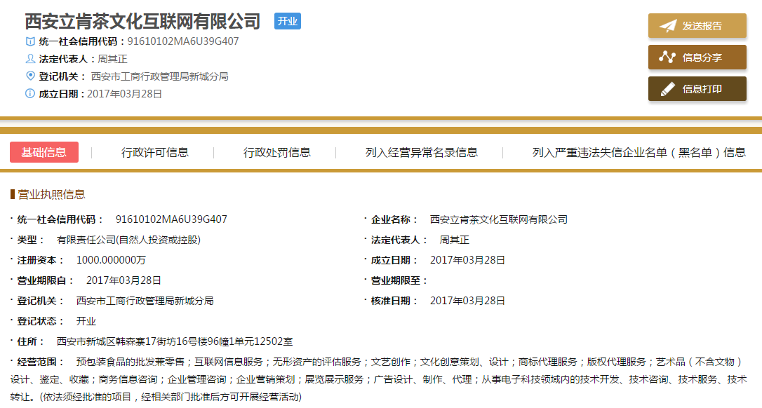 直销头条网编辑在国家企业信用信息公示系统查询到西安立肯成立于2017年03月28日,注册资金1000万人民币,法人代表周其正,总裁崔立果,董事长周其正,副董事长于杰,董事兼总经理张连波,监事有李海婷、于芳、吴毅,董事有方晓燕、张连波、刘仁德。股东有刘仁德、张连波、于杰、方晓燕、周其正。