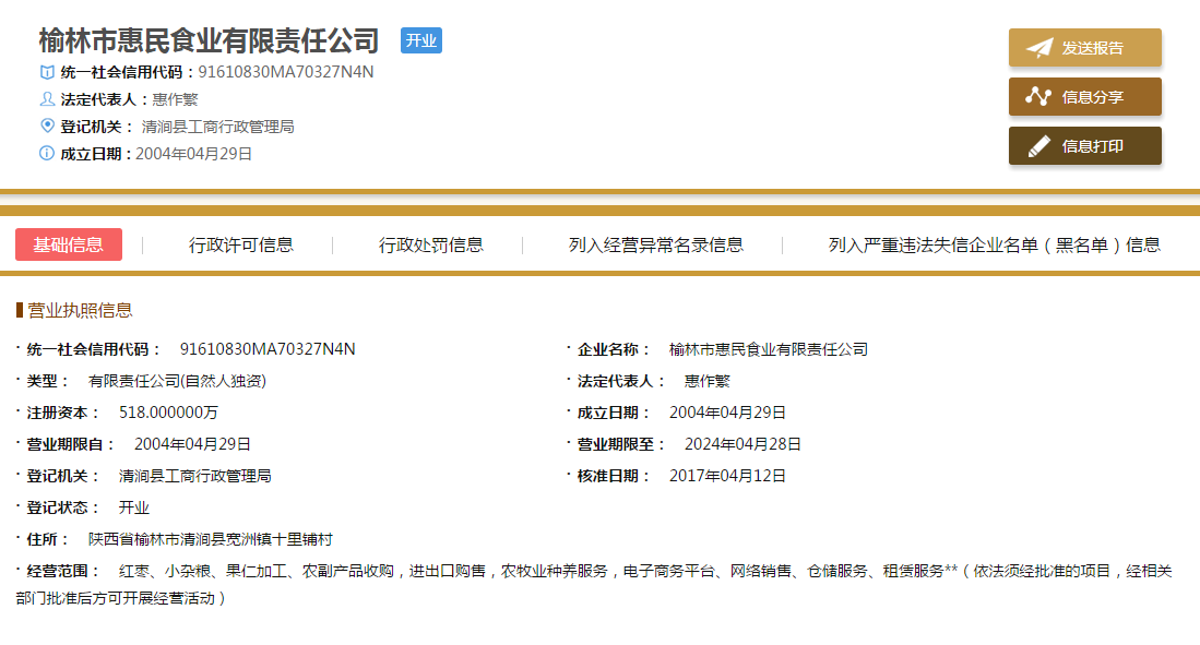 直销头条网编辑在国家企业信用信息公示系统查询到惠民食业成立于2004年04月29日,注册资金518万人民币,法人代表惠作繁,行政董事惠作繁,股东惠作繁。