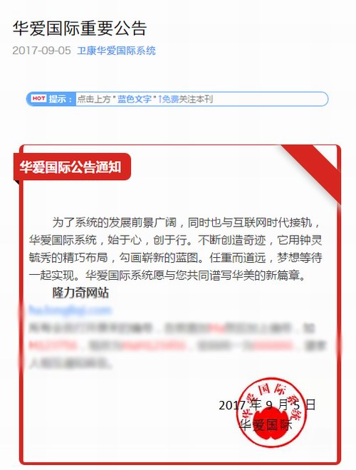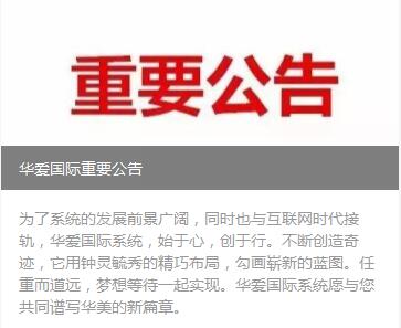 9月5日,华爱国际系统发布重要公告。公告表示:为了系统的发展前景广阔,同时也与互联网时代接轨,华爱国际系统,始于心,创于行。不断创造奇迹,它用钟灵毓秀的精巧布局,勾画崭新的蓝图。值得一提的是,公告中提到公司为隆力奇。这意味着华爱国际系统已离开卫康加盟隆力奇。