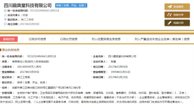 直销头条网编辑在国家企业信用信息公示系统查询到藏奥堂成立于2017年03月09日,注册资金200万人民币,法人代表陈建,行政董事加总经理陈建,监事高英,股东有陈建、高英。