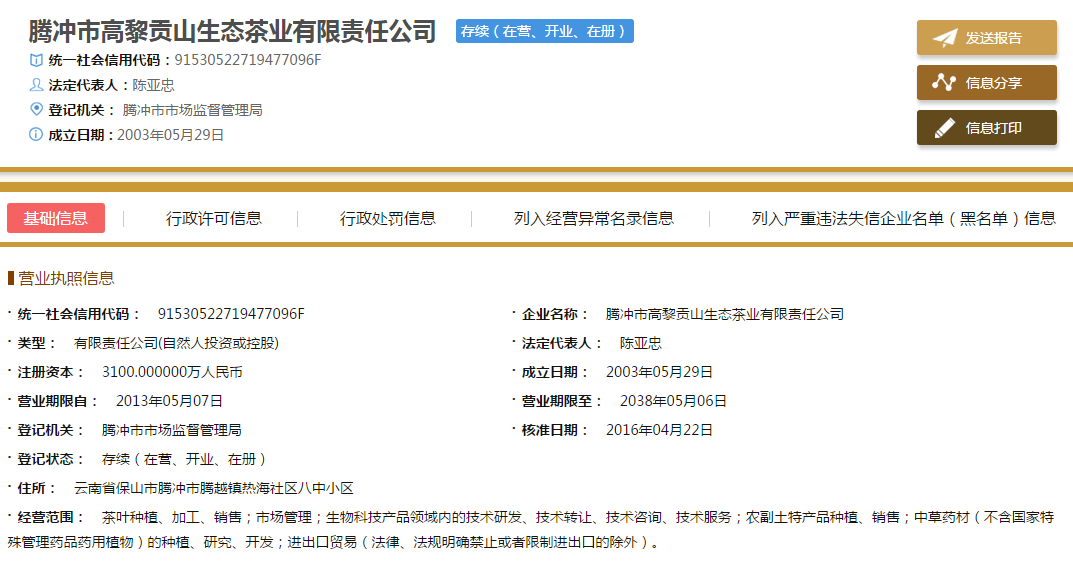 据高黎贡山官网资料显示,腾冲市高黎贡山生态茶业有限责任公司,是一家集茶叶栽培、加工、销售、技术研发为一体的省级重点龙头企业。“高黎贡山”商标荣获“中国驰名商标”,公司排名中国茶叶行业百强。公司现有优质茶加工总厂1个,茶文化交流中心1个,分厂16个,联营茶所26个,职工486人,自营茶园9000亩,辐射带动茶园12万多亩,挂牌保护古茶树3万多棵,带动农户8万多户,直接受益茶农32万多人。公司依托高黎贡山独有的自然资源和茶园种植优势,以普洱茶、绿茶、红茶、乌龙茶加工为主,产品通过国家QS、有机食品、绿色食品认证,畅销省内外及港澳台地区,出口缅甸、马来西亚等国家,多年来深受消费者的青睐。