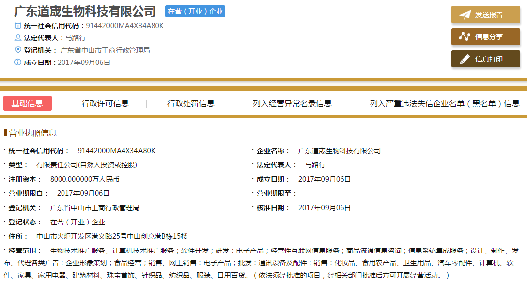 直销头条网编辑在国家企业信用信息公示系统查询到道宬生物成立于2017年09月06日,注册资金8000万人民币,法人代表马路行,行政董事兼经理马路行,监事黄朱超军,股东有高志松、马路行、朱超军、李治才。
