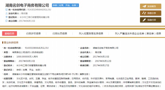 据名创天下公司官网资料显示,湖南名创电子商务有限公司于2017年成立,坐落于美丽星城长沙,毗邻湘江,是一家集电子商务、文化艺术、金融、市场整合营销及品牌运营于一体的综合性企业。公司股东和经营团队作为核心成员拥有超过百年成功营销经验,是众多营销界殿堂级领袖。 公司旗下拥有独立运营的电子商务平台名创天下商城,是以全新的互联网+金融+新电商销售模式的综合性购物商城,采用B2B2C的电商模式,并以黑茶引领,让消费者可享受物美价廉的商品和体贴优质的服务。 商城视品质为生命,传承匠心精神,打造匠心服务,以百年经验做百年企业。同时,商城的全新商业模式提供增值服务,不仅让消费者有机会免费购物,更有机会获取额外的增值收益。
