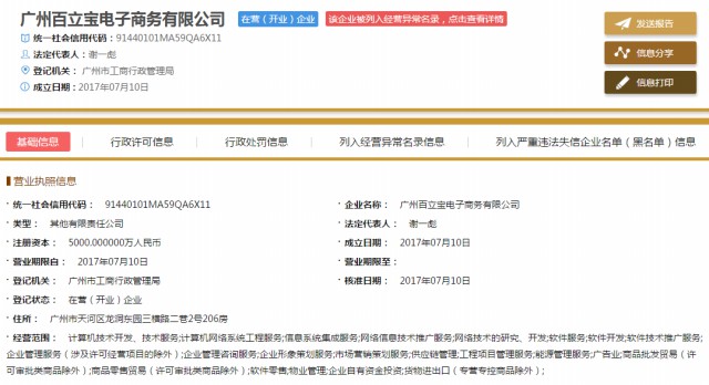 直销头条网编辑在国家企业信用信息公示系统查询到百立宝成立于2017年07月10日,注册资金5000万人民币,法人代表谢一彪,监事杨雅维,股东有广东宣宇文化传媒股份有限公司、广州市御钻珠宝首饰有限公司。