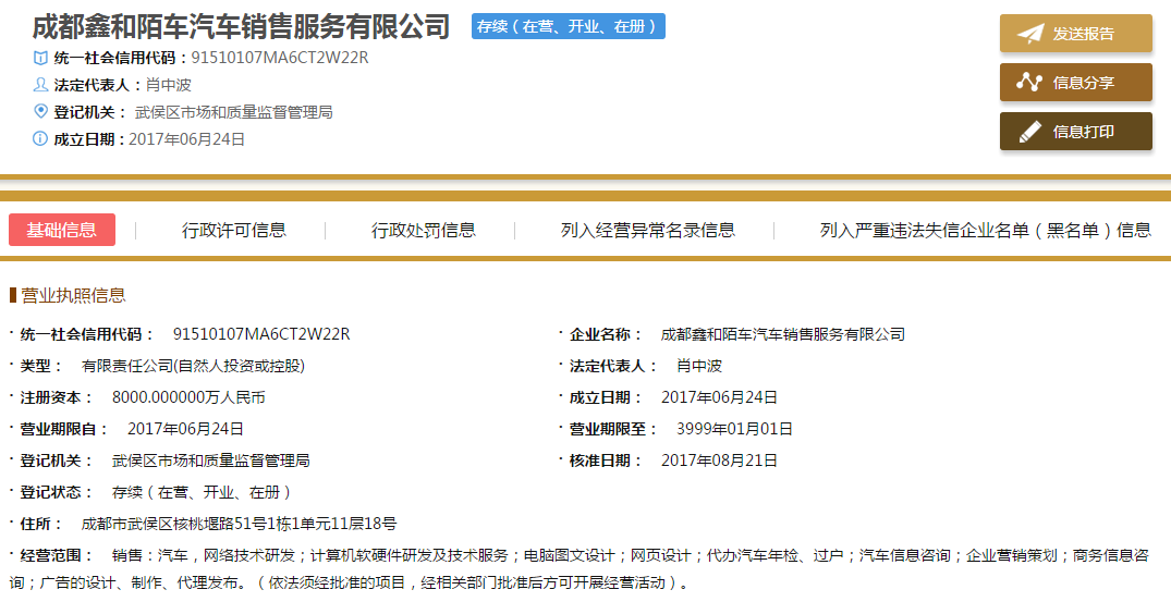 直销头条网编辑在国家企业信用信息公示系统查询到鑫和陌车成立于2017年06月24日,注册资金8000万人民币,法人代表肖中波,行政董事兼总经理肖中波,监事邹本杨,股东有肖中波、邹本杨。