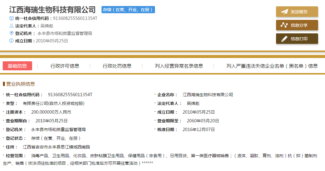直销头条网编辑在国家企业信用信息公示系统查询到海瑞生物成立于2010年05月25日,注册资金200万人民币,法人代表吴绵彪,行政董事兼总经理吴绵彪,监事王花兰,股东有王花兰、吴绵彪。