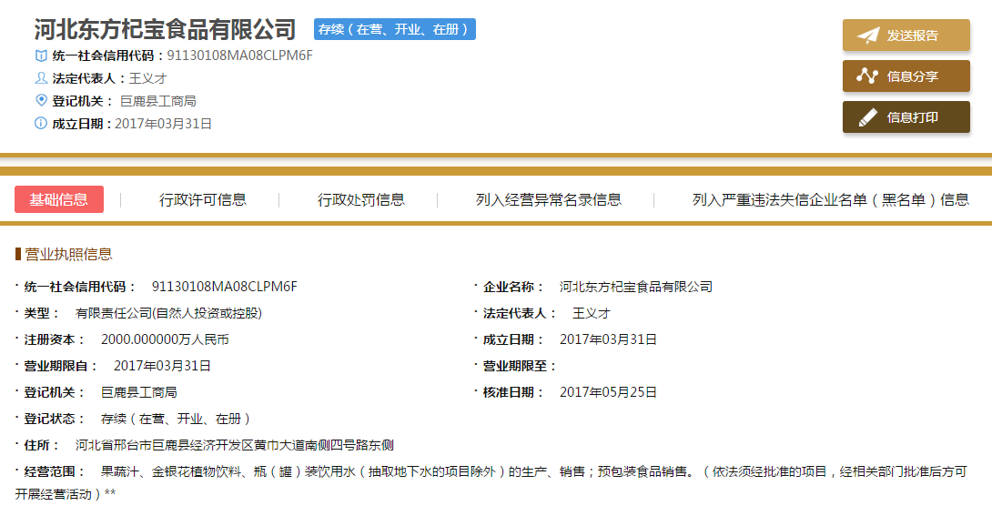 直销头条网编辑在国家企业信用信息公示系统查询到东方杞宝成立于2017年3月31日,注册资金2000万人民币,法人代表王义才,执行董事王义才,经理谷广霞,监事王立军,股东有王义才、谷广霞。