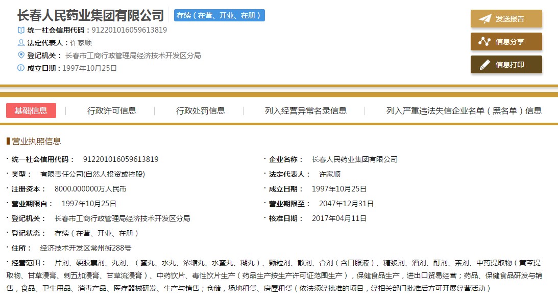 据人民药业官网资料显示,长春人民药业集团,溯源于1795年在北京创建的中华老字号——“北京长春堂”。长春人民药业集团于2013年投巨资开发建造新厂,入驻长春经开医药产业园,严格按欧盟标准,通过国家GMP、GSP认证,以国药精品、大健康科技产业为主导,是涉足大健康全产业链的集研发、生产、销售、服务于一体的高新技术集团企业。集团旗下拥有长春人民药业集团医药有限公司、长春人民药业集团中药科技有限公司、吉林省金佰康生物技术有限公司、长春圣洁力生物技术有限公司、长春嘉恒中药材饮片有限公司等五个子公司。主要经营范围包括:中药材种植、中药饮片生产、植物提取生产,口服制剂204个国药准字号生产、生物医疗器械、功能型化妆品及保健食品生产、供应链集成、连锁门店经营及进出品贸易等。
