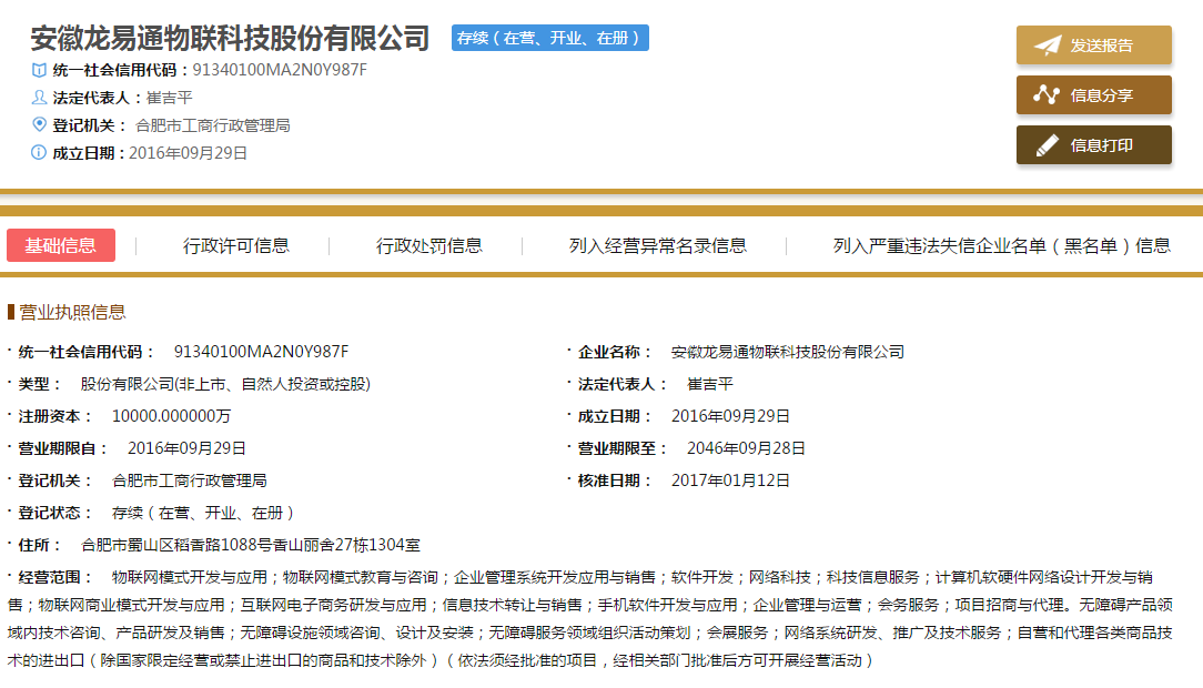 直销头条网编辑在国家企业信用信息公示系统查询到龙易通成立于2016年09月29日,注册资金10000万人民币,法人代崔吉平,执行董事兼总经理崔吉平,监事有何玉、汪祥菊、方季靖,董事有汪彬、凡超峰、纪小翠、李刚,股东有李刚、汪彬、方季靖、凡超峰、崔吉平、纪小翠。