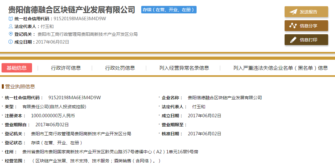 据网络资料显示,贵阳信德融合区块链产业发展有限公司主体公司在国家举办的第三届全球数博会上成为唯一一个成功签约茅台集团天朝上品酒业公司,用贵人酒系列产品作为背书发行区块链贵人积分。