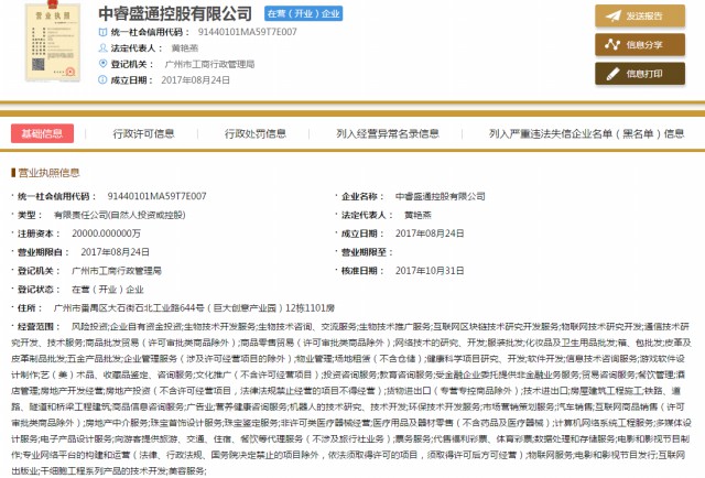 直销头条网编辑在国家企业信用信息公示系统查询到中睿盛通成立于2017年08月24日,注册资金20000万人民币,法人代表黄艳燕,行政董事黄艳燕,监事黄德洪,股东有李征勤、林卫杰、洪倩、彭碧云、董伍朋。