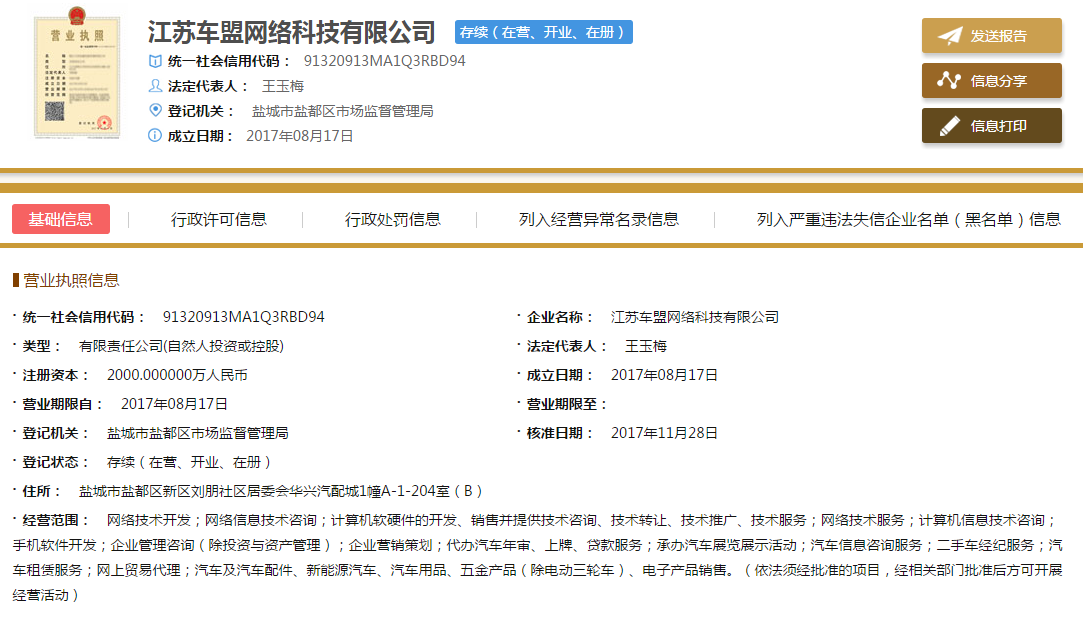 另据国家企业信用信息公示系统信息显示,车盟网络成立于2017年08月17日,注册资金2000万人民币。法人代表王玉梅,行政董事兼总经理王玉梅,监事邢国军,自然股东有王玉梅、邢国军。