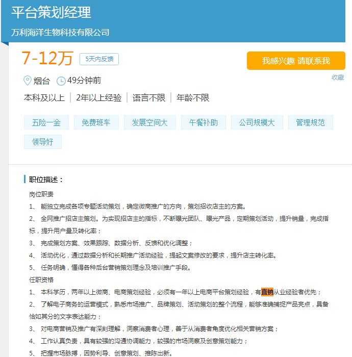 直销百科网注意到,2017年11月份,在猎聘网站上,万利海洋有多个岗位在招聘直销人才,包括产品培训经理(直销)、直销企划总监(经理)、产品培训讲师(直销)、直销IT、平台策划经理等。