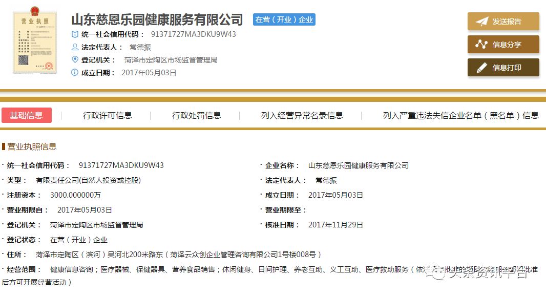直销头条网编辑在国家企业信用信息公示系统查询到慈恩乐园成立于2017年05月03日,注册资金3000万人民币。法人代表常德振,行政董事兼总经理常德振,监事董瑞召,自然股东有解丽荣、田效亭、韩全胜、赵代云、赵代云、胡秀平、解丽荣、田效亭、韩全胜、赵代云、胡秀平。