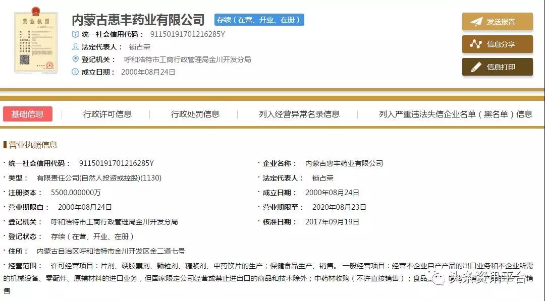 据惠丰药业官网资料显示,蒙古惠丰药业有限公司注册于呼和浩特市金川开发区民营高科技园区,2003年11月正式投产。资产总额1.3亿元,其中无形资产总计1242万元。惠丰药业经过十数年的艰苦奋斗,已发展成为集科研、生产、销售于一体的综合性药品生产企业。惠丰药业主要以生产中成药、蒙药为主,化学药为辅的新型综合性制药工业企业。2003年通过了1998年版药品GMP认证和ISO14000环境管理体系、ISO9000质量管理体系双认证,2015年10月通过2010年修订版药品GMP认证。