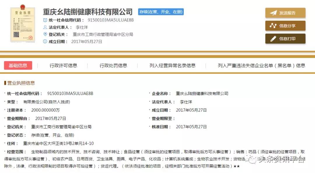 直销头条网编辑在国家企业信用信息公示系统查询到幺陆捌健康成立于2017年05月27日,注册资金2000万人民币。法人代表李仕洋,行政董事兼总经理李仕洋,监事周宇斌,自然股东李仕洋。