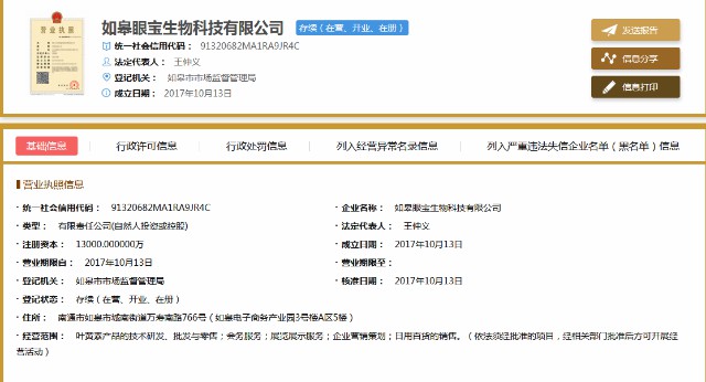 直销头条网编辑在国家企业信用信息公示系统查询到如皋眼宝生物科技有限公司成立于2017年10月13日,注册资金13000万人民币。法人代表王仲义,自然股东 郑洪行 梁君。