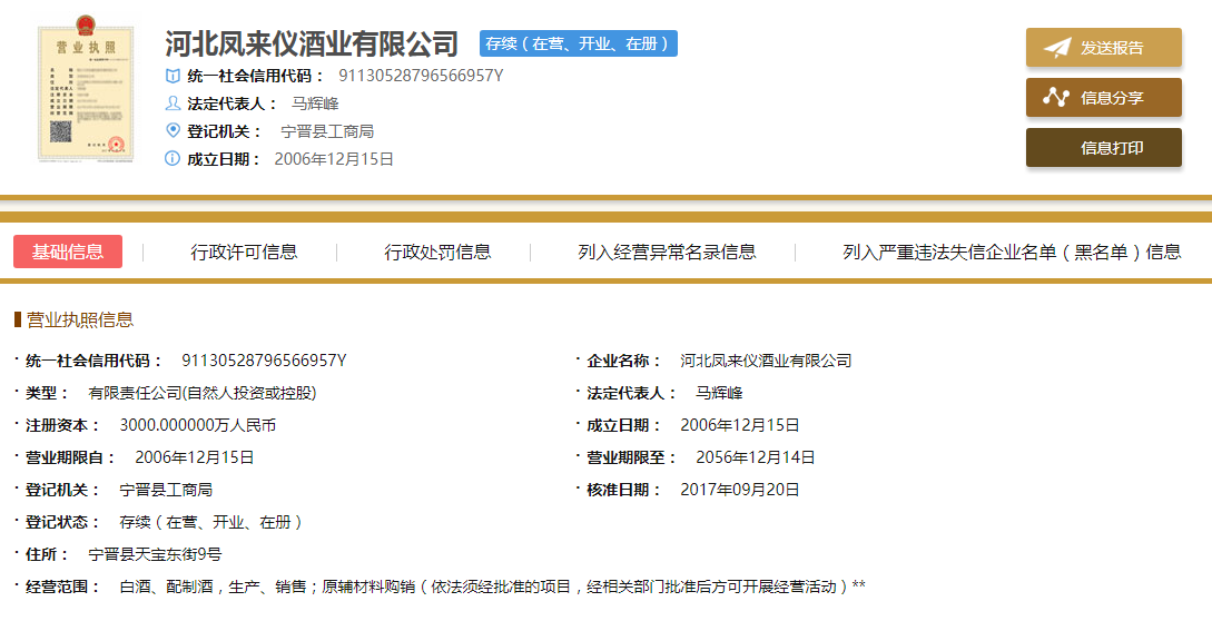 直销头条网编辑在国家企业信用信息公示系统查询到凤来仪酒业成立于2006年12月15日,注册资金3000万人民币。法人代表马辉峰,董事长史金国,经理马辉峰,董事有史金国、马辉峰、赵贵民,监事有张艳辉、石金栓、周辉。
