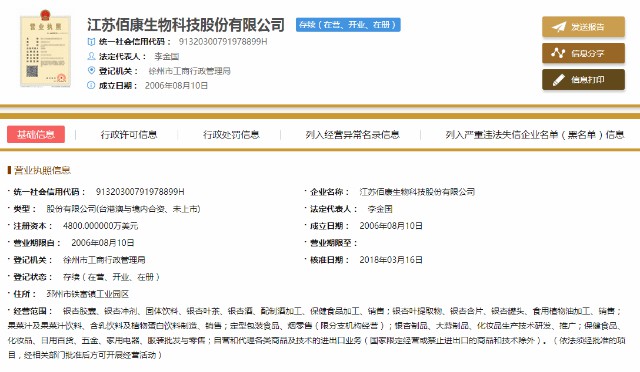 据佰康生物官网资料显示,江苏佰康生物科技股份有限公司创建于2006年,位于著名的银杏之乡——江苏省邳州市,座落于国家级银杏博览园、国家银杏GAP生产基地。公司秉承"以科技为先导、营造健康生活"的理念,以市场需求为导向,以输送健康为己任,不断创新研发,依托尖端的生物技术生产的银杏系列胶囊、植物营养素、银杏精华素、养生酒等系列产品,深得广大消费者的认可和青睐。公司现已发展成为集研发、生产、销售为一体的现代化科技型企业,并于2013年10月在上海股权交易平台成功挂牌。公司作为国家省级高新技术创新示范单位,自主研发生产的十多款产品,被中国中轻工产品质量保障中心评为"质量信得过产品",其中三项获得国家专利,企业通过了ISO9001:2008质量管理体系、ISO14001:2004环境管理体系的认证,并先后荣获3.15全国质量诚信放心示范单位、人才工作先进单位、消费者特别推荐质量信得过放心优质产品示范单位、农业产业化龙头企业等荣誉称号。