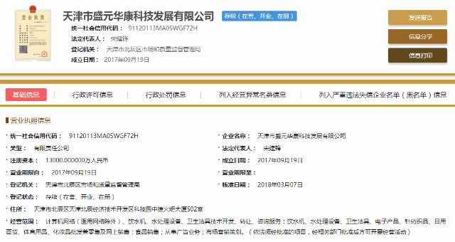 直销头条网编辑在国家企业信用信息公示系统查询到盛元华康成立于2017年09月19日,注册资金13000万人民币。法人代表宋建锋,执行董事兼总经理宋建锋,监事海英梅,自然股东有海英梅、张学善。