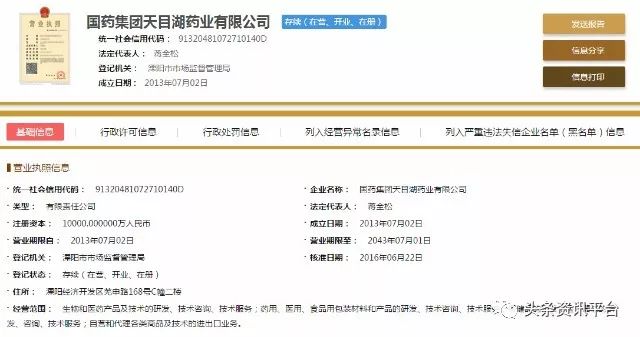 直销头条网编辑在国家企业信用信息公示系统查询到天目湖药业成立于2013年07月02日,注册资金10000万人民币。法人代表蒋全松,董事长蒋全松,副董事长王浩,董事兼总经理周延,董事有李建其、陆伟根、潘唱川,监事张红兵,自然股东有潘唱川、江苏联盟化学有限公司、上海医药工业研究院。