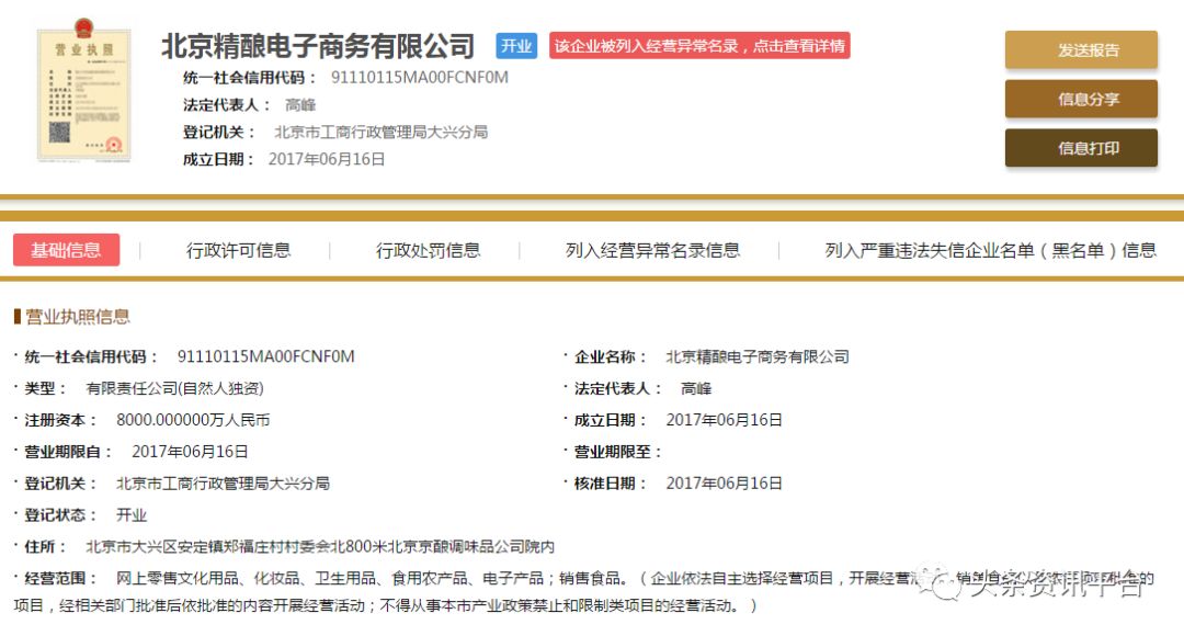 直销头条网编辑在国家企业信用信息公示系统查询到北京精酿(该企业被列入工商部门经营异常名录)成立于2017年06月16日,注册资金8000万人民币。法人代表高峰,执行董事王金香,监事李秀平,经理高峰,自然股东高峰。