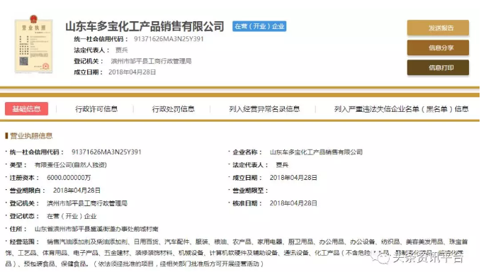 直销头条网编辑在国家企业信用信息公示系统查询到山东车多宝成立于2018年04月28日,注册资金6000万人民币。法人代表贾兵,执行董事兼经理贾兵,监事夏玉芹,自然股东贾兵。
