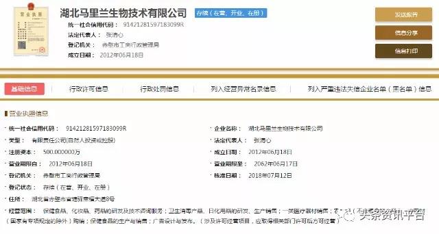 直销头条网编辑在国家企业信用信息公示系统查询到湖北马里兰生物成立于2012年06月18日,注册资金500万人民币(实缴资金300万人民币)。法人代表张清心,执行董事兼总经理张清心,监事李红,自然股东有李红、张清心。
