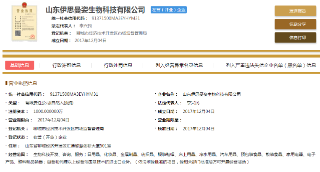 直销头条网编辑在国家企业信用信息公示系统查询到伊思曼姿成立于2017年12月04日,注册资金1000万人民币。法人代表李兴民,执行董事兼总经理李兴民,监事柳国富,自然股东李兴民。