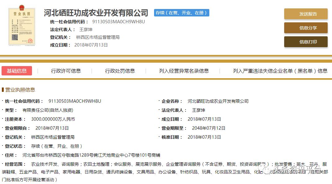 直销头条网编辑在国家企业信用信息公示系统查询到河北硒旺功成成立于2018年07月13日,注册资金3000万人民币。法人代表王彦坤,执行董事兼经理王彦坤,监事姜哲谦,自然股东王彦坤。