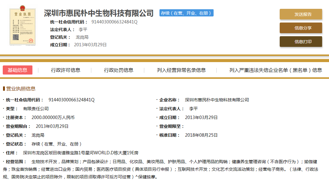 直销头条网编辑在国家企业信用信息公示系统查询到惠民朴中成立于2013年03月29日,注册资金2000万人民币(实缴资金200万元)。法人代表李平,执行董事兼经理李平,监事李陈康,自然股东有李世才、李文杰、庞建春、李平、董丹舟。