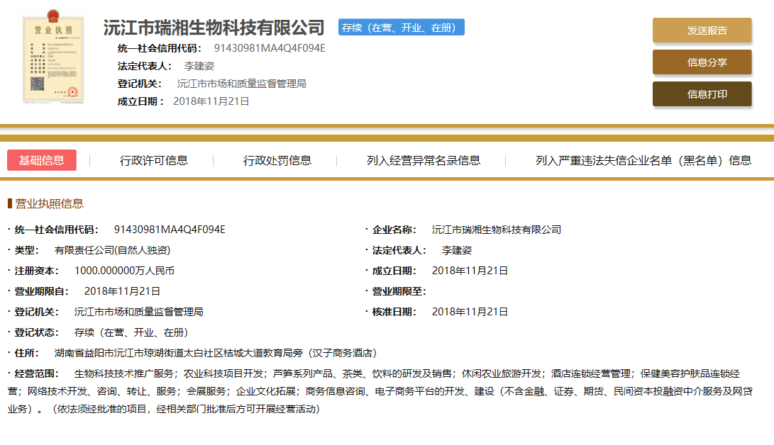 直销头条网编辑在国家企业信用信息公示系统查询到沅江瑞湘生物成立于2018年11月21日,注册资金1000万人民币(实缴资金0元)。法人代表李建姿,执行董事兼经理李建姿,监事袁世凡,自然股东李建姿。