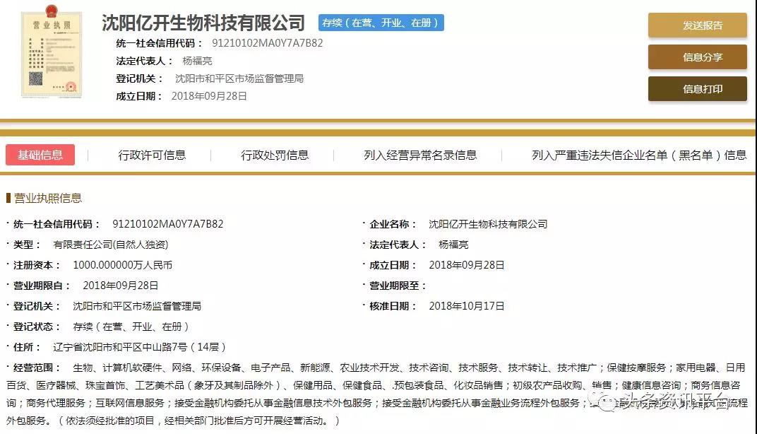 直销头条网编辑在国家企业信用信息公示系统查询到沈阳亿开生物成立于2018年09月28日,注册资金1000万人民币(实缴资金0元)。法人代表杨福亮,执行董事兼经理杨福亮,监事刘淑焕,自然股东杨福亮。