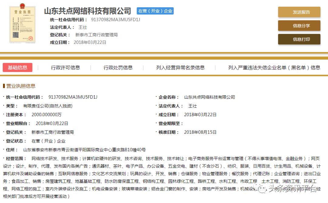 直销头条网编辑在国家企业信用信息公示系统查询到山东共点网络成立于2018年03月22日,注册资金2000万人民币(实缴资金0元)。法人代表王壮,执行董事兼经理王壮,监事张振伟,自然股东王壮。