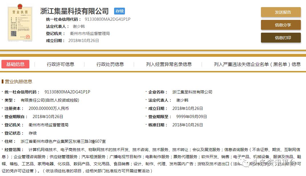 直销头条网编辑在国家企业信用信息公示系统查询到浙江集呈科技成立于2018年10月26日,注册资金2000万人民币(实缴资金0元)。法人代表谢少韩,行政董事兼经理谢少韩,监事刘忱,自然股东有谢少韩、刘忱。