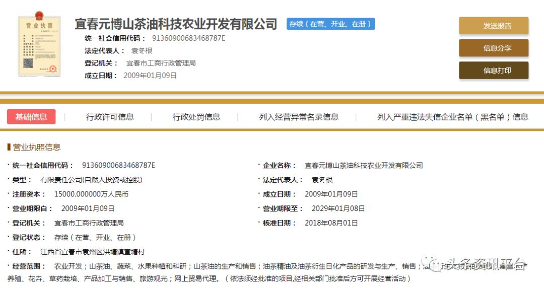 直销头条网编辑在国家企业信用信息公示系统查询到宜春元博山茶油成立于2009年01月09日,注册资金15000万人民币(实缴资金15000万元)。法人代表袁冬根,行政董事袁冬根,总经理易大发,监事熊文,自然股东有熊文、易大发、陈习活、夏树英。