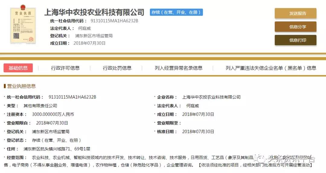 直销头条网编辑在国家企业信用信息公示系统查询到上海华中农投成立于2018年07月30日,注册资金3000万人民币(实缴资金0元)。法人代表何庭威,董事长何庭威,总经理何庭威,董事湛国峰,监事刘永红,自然股东有北京佰润迅达科技有限公司、北京兴达邦区块链科技有限公司、上海赋维投资管理中心(有限合伙)、中农投区块链科技股份有限公司。