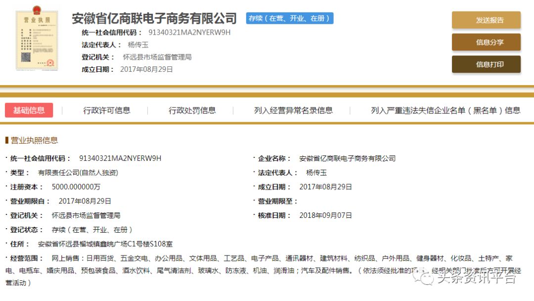 直销头条网编辑在国家企业信用信息公示系统查询到安徽亿商联成立于2017年08月29日,注册资金5000万人民币(实缴资金0元)。法人代表杨传玉,行政董事兼总经理杨传玉,监事刘安双,自然股东杨传玉。